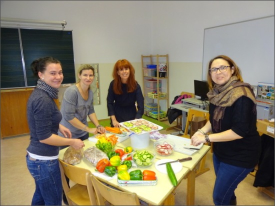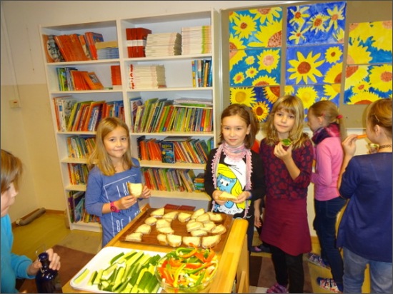 Heute bekamen die Schülerinnen und Schüler der Klosterschule in Neusiedl am See eine gesunde Jause. In der Früh kamen freiwillige Mütter und Väter zum Vorbereiten der Speisen. Zu Butterbroten gab es viel Gemüse und anschließend köstliches Obst.