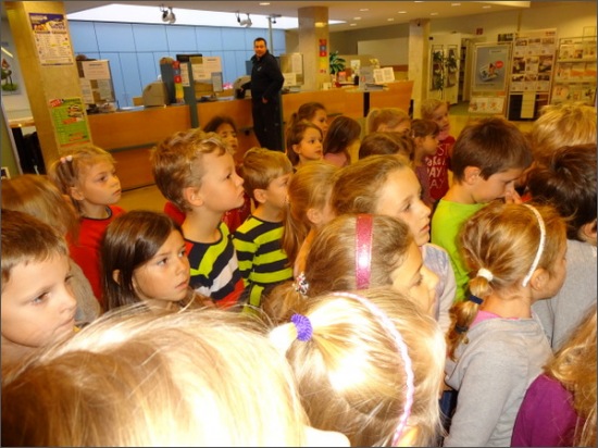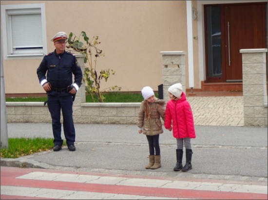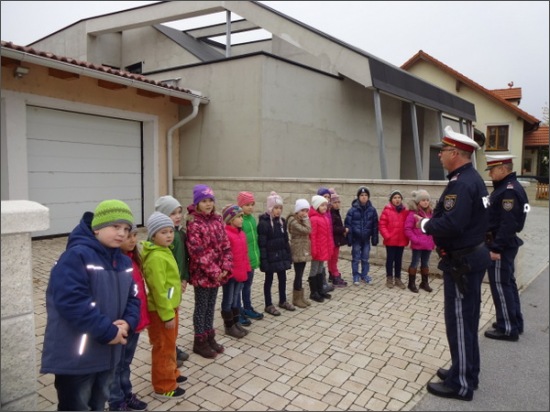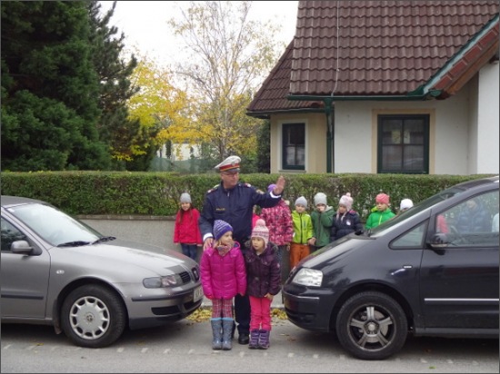 Die ersten Klassen hatten heute Besuch von 2 Polizeibeamten. "Learning by doeing" lautete die Devise. So machten sich die Schülerinnen und Schüler gemeinsam mit ihren Lehrerinnen und den Polizisten auf den Weg zum Zebrastreifen am Gartenweg. Dort lernten die Kinder das richtige Überqueren der Straße am Schutzweg. Die Polizisten zeigten den Buben und Mädchen auch, worauf zu achten ist, wenn man zwischen parkenden Autos über die Straße gehen will.