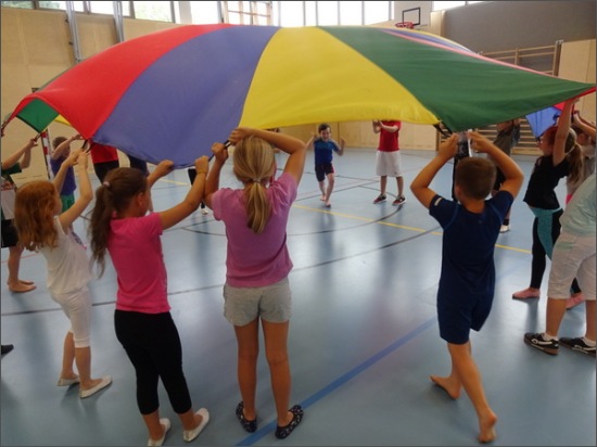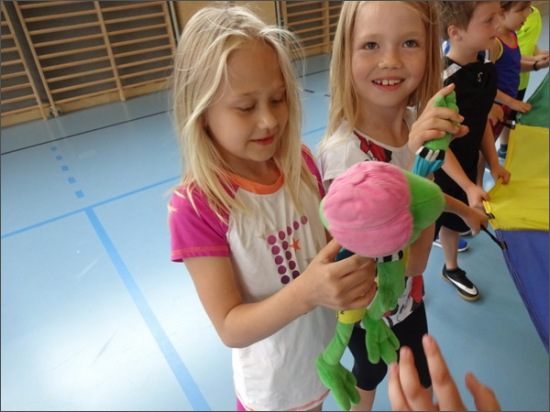 Die ersten und zweiten Klassen hatte Besuch vom Turnfrosch Hopsi Hopper. Gemeinsam verbrachten sie eine Turnstunde im Turnsaal. Bei verschiedenen Bewegungsspielen und lustigen Übungen mit dem Schwungtuch kamen die Schülerinnen und Schüler ordentlich ins Schwitzen.