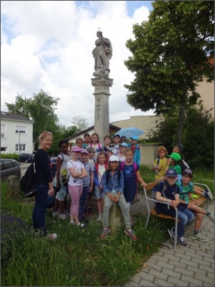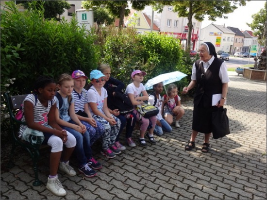 Mit Schwester Thekla machten sich die Kinder der 3a und ihre Klassenlehrerin heute auf eine Reise durch Neusiedl am See. Sie besuchten die verschiedenen Marterl, Kreuze und Kapellen in der Stadt. Schwester Thekla erzählte den Kindern interessante Geschichten über die verschiedenen Stellen. Die Reise begann bei der Kaserne in Neusiedl am See und endete beim Bahnhof. Zwischendurch trafen sie auch eine Frau, die vor ihrem Geschäft an einem Webstuhl saß und arbeitete. Kurzerhand führte sie unsere Schülerinnen und Schüler durch ihr Geschäft und erzählte ihnen von ihrer Tätigkeit.Nach einer kurzen Rast und der Jause ging die Reise weiter. Zum Abschluss durften die Kinder im Garten ihrer Klassenlehrerin spielen.
