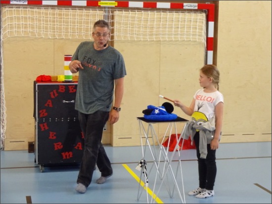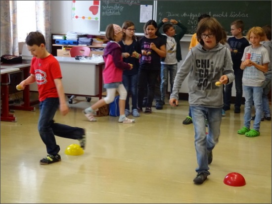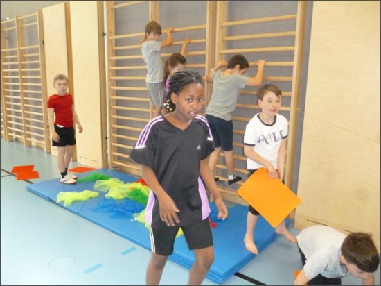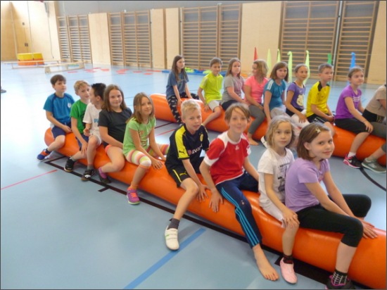 Die Kinder der 3. und 4. Klassen erlebten heute eine Turnstunde mit dem Frosch Hopsi Hopper. Es wurde Bewegung mit verschiedenen Turngeräten gemacht und der Turnsaal war voll Leben. Sichtlich motiviert und voll bei der Sache waren die jungen Turnerinnen und Turner.