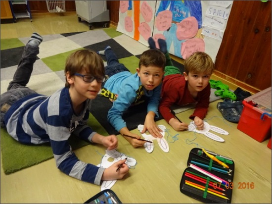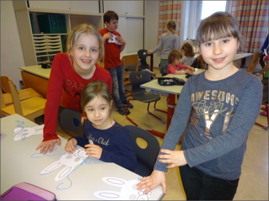 Die Kinder der 3a und 3b hatten heute Besuch von der Bärengruppe und der Fischegruppe des Kindergarten Gartenweg. Zur Begrüßung wurde ein gemeinsames Lied gesungen. Danach wurde der Osterworkshop mit verschiedenen Stationen eröffnet. Highlight war das Fotoshooting mir den selbst gebastelten Hasenmasken. Zum Abschluss erhielt jedes Kind ein süßes Dankeschön!