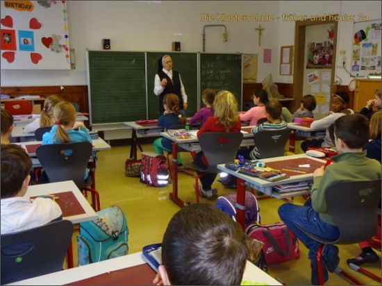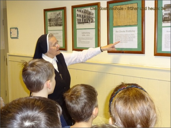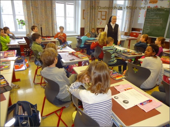 Schwester Thekla besuchte heute die 3a. Sie erzählte den Schülerinnen und Schülern von der Ordensgründerin, der Schulstifterin und dem Leben früher hier im Kloste. Anschließend machten die Kinder mit Schwester Thekla einen Rundgang durchs Schulgebäude. Dabei erklärte sie den Kindern, wie das Haus früher ausgesehen hat. Anhand der Bilderwand konnten die Mädchen und Buben die Entwicklung der Klosterschule verfolgen. Viele interessante Fragen der Kinder beantwortete Schwester Thekla mit großer Freude! Die Schülerinnen und Schüler waren sehr eifrig und konzentriert bei der Sache.