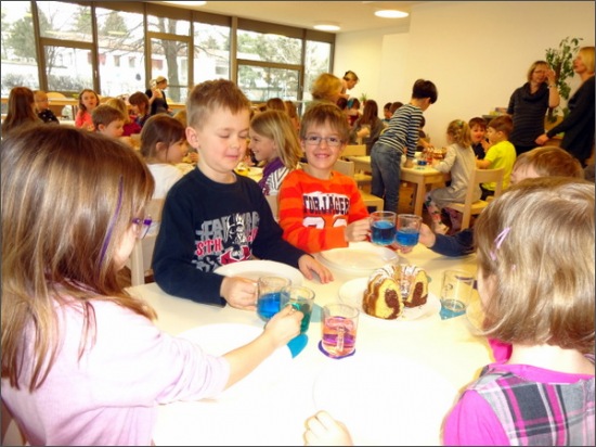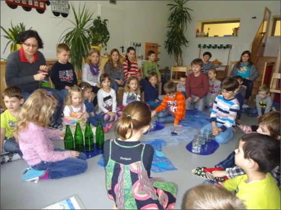 Wir wurden mit Wassermusik herzlich begrüßt und nach einer sehr interessanten Wassertropfengeschichte sangen uns die Kindergartenkinder das Lied vom "musikalischen Wasserhahn" vor, das wir mit unterschiedlichen Wasserorgeln, die wir selbst befüllt haben, begleiten durften. Gemeinsam sangen und musizierten wir. Anschließend färbten wir das Wasser mit Lebensmittelfarbe und stellten sogar Mischfarben damit her. Das Wasser konnten alle Kinder bei einer gemeinsamen Jause mit selbstgebackenem Gugelhupf trinken. Wir hatten viel Spaß und machten begeistert mit.