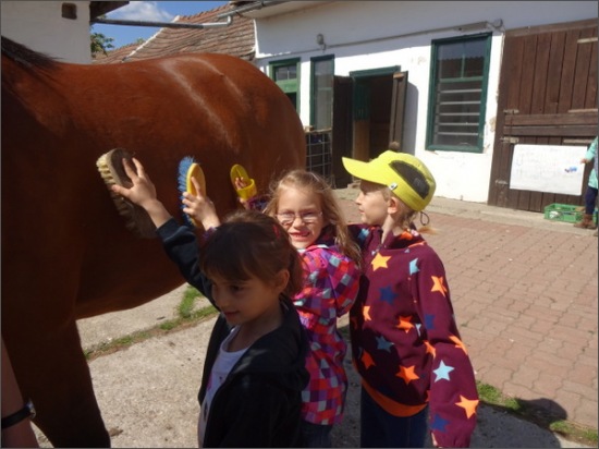 Gemeinsam mit Frau Lehrer Sattler durfte währenddessen immer eine Kleingruppe zu den Pferden und erfuhr viel über den Körperbau dieser Tiere, die Körperpflege, die Haltung und die Nahrung.