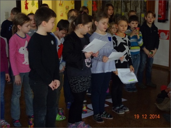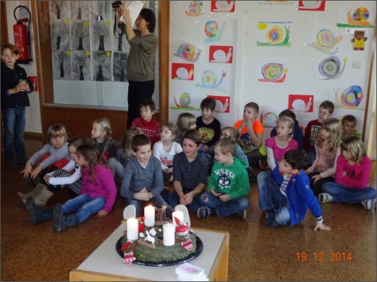 Mit Gedichten und Liedern gestalteten die 4. Klassen die letzte Adventbesinnung. Mit den Themen Friede, Freundschaft und Vergebung führten sie uns näher hin zur Geburt Christi im Stall von Betlehem. Als Abschluss gab es die 4. Kerze für jedes Kind. Der Satz "Wir warten auf Weihnachten" war somit vervollständigt. Als Geschenk gab es für jedes Kind noch einen gebastelten Papierstern als Andenken.