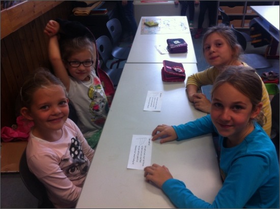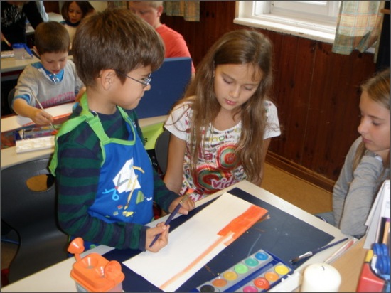 Gemeinsam bereiteten sich die Partnerklassen auf den 26. Oktober vor. Die Kinder der 4. Klasse zigten den Kleinen den Umgang mit Pinsel und Wasserfarben. Es wurden Fahnen gezeichnet. Außerdem erlernten die Schülerinnen und Schüler gemeinsam ein Gedicht.