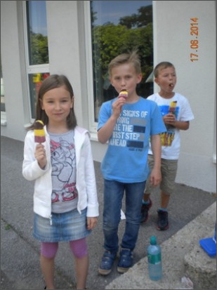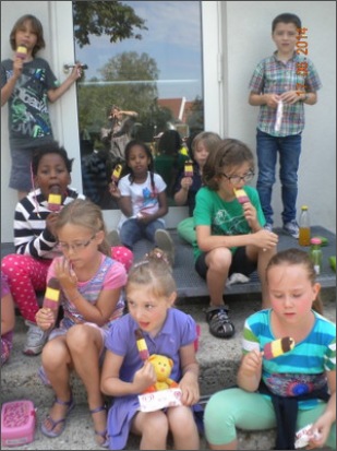 Als Belohnung für die fleißige Arbeit in diesem Schuljahr, machte Frau Samek, Mutter in der 1a, der Klasse eine große Freude. Jedes Kind bekam ein Eis spendiert, das genüsslich im Schulhof vernascht wurde.