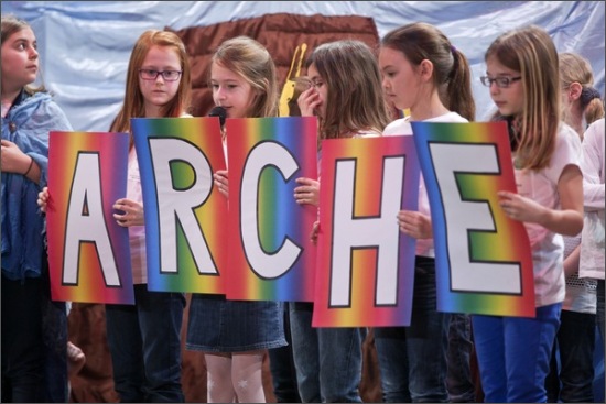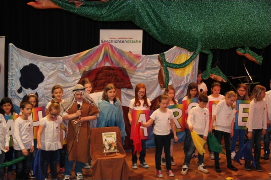Wir (insgesamt 26 Kinder aus der 3a, 3b und der 4. Klasse) durften als eine von 5 Schulen des Burgenlandes beim Geschichtendrachenfest am 2. April in Mattersburg unsere Schulgeschichte präsentieren. Vor einem Publikum von beinahe 200 Schülerinnen und Schülern und vielen Erwachsenen, darunter einige Prominente unseres Landes, stellten wir die Bibelgschichte "Noahs Arche" vor und wurden dafür mit großem Applaus und einem Brettspiel vom Buchklub belohnt.