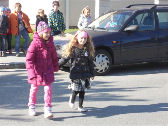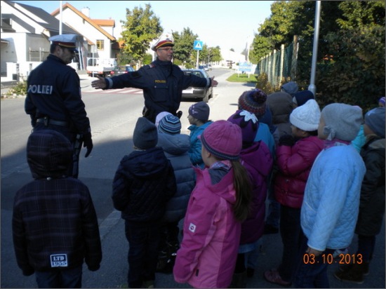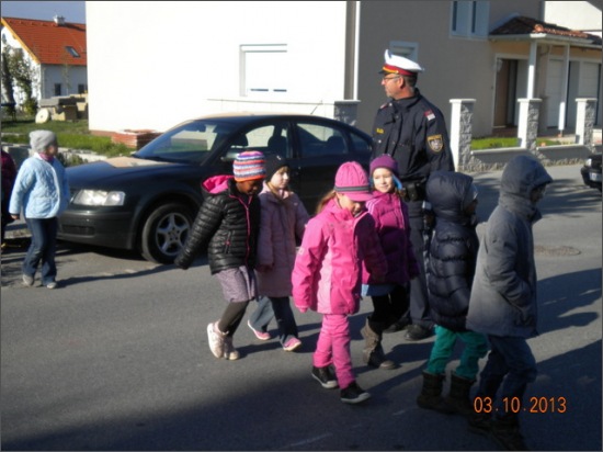 Heute hatten die Schülerinnen und Schüler der ersten Klassen ganz besonderen Unterricht. Gemeinsam mit zwei Beamten der Polizei Neusiedl am See gingen die Kinder hinaus und lernten das richtige Überqueren der Straße. Sie übten das Verhalten am Zebrastreifen, zwischen parkenden Autos und die Bedeutung der Zeichen eines Verkehrspolizisten.