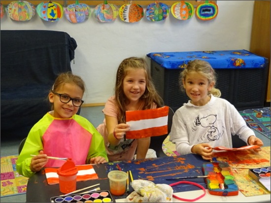 Diese Woche waren die Partnerklassen sehr fleißig. Gemeinsam wurden nämlich in den verschiedenen Schulstufen Fahnen für den Nationalfeiertag und den Landesfeiertag hergestellt.