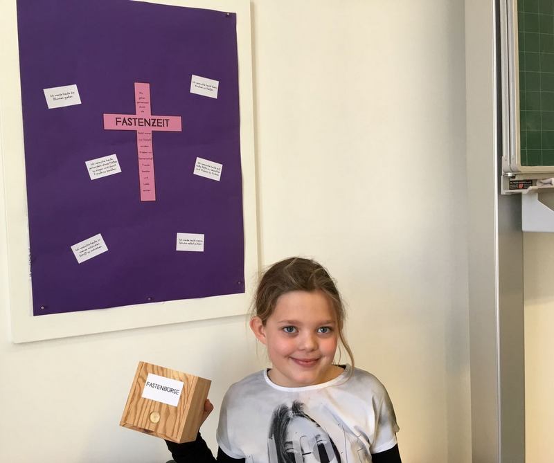 Das Wort „Fasten“ wird immer wieder als Verzicht auf etwas Schönes oder Gutes interpretiert. Mit Hilfe von der Klassenlehrerin erarbeiteten die Schülerinnen und Schüler am Aschermittwoch, was sie tun könnten, um anderen Freude zu bereiten. Auch wurde ihnen bewusst, dass durch das Fasten beim Fernsehkonsum die Zeit mit Freunden oder Familie genutzt werden kann. Gemeinschaft erleben ist somit eine Belohnung für das Fasten. 28 Schultage verbringen die Kinder bis zum Osterfest in der Klassengemeinschaft. Für jeden Tag haben sie sich eine Aufgabe gestellt, die sie versuchen, freiwillig zu lösen (z.B. „Ich versuche heute, jemandem etwas Nettes zu sagen und damit Freude zu bereiten.“ oder „Ich helfe heute meinen Eltern beim Abräumen des Tisches.“) Alle Ideen wurden in einer „Fastenbörse“ gesammelt. Jeden Morgen wird eine Aufgabe gezogen und auf ein Plakat geklebt. Die Kinder sind mit großem Eifer dabei – so schön kann Fasten sein!